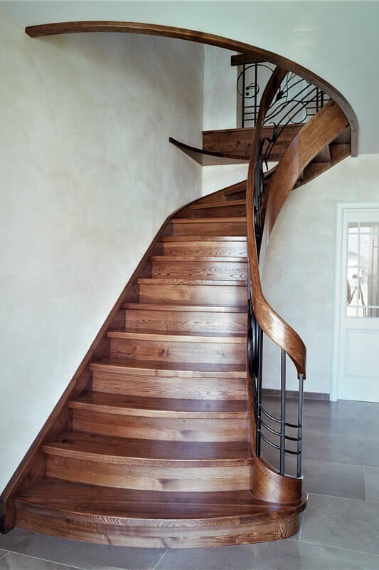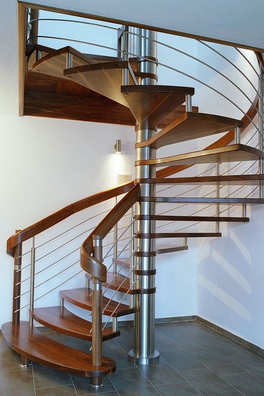 Centralny słup nośny, na którym osadzone są stopnie. Płynnie wygięta poręcz otacza i zamyka bieg schodowy.